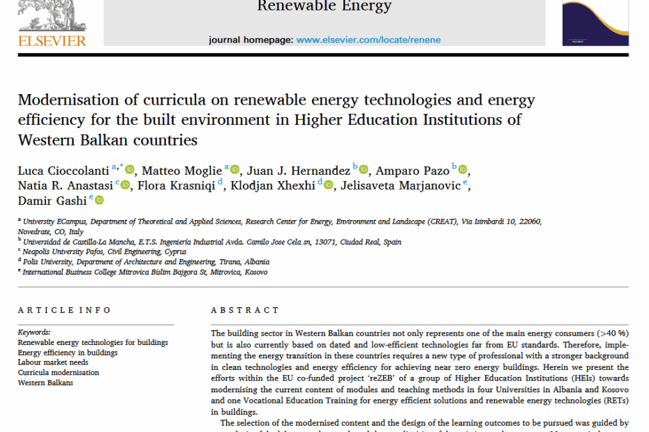 Buildings in the Western Balkans (WB) lack severely when it comes to the performance demands on energy efficiency set forth by the European Commission. The need to support the region’s building sector to achieve better performance resulted in identifying a requirement for higher education reform, incorporating components of both active and passive design elements and engineering on energy efficiency, in programs that relate to construction. Within the scope of the EU co-funded project “reZEB- Fostering Renewable energy technologies and energy efficiency knowledge towards new zero energy buildings of engineers and professionals in Western Balkan countries”, a group of seven universities and one vocational school cooperated to modernize curricula in Bachelor’s and Master’s programs. The project modernized sixteen modules and introduced ten new modules in various fields pertaining to sustainability in the built environment. The process included technical aspects, supported through advanced laboratory equipment and applications. Herein, we present a rare example of a comprehensive effort to modernize curricula and improve targeted professional skills in Albania and Kosovo. The paper describes the process followed and the educational targets covered, and discusses the preliminary results of the assessment feedback, aiming to produce professionals able to understand and take advantage of the opportunities that green technologies offer on environmental, social and economic levels.